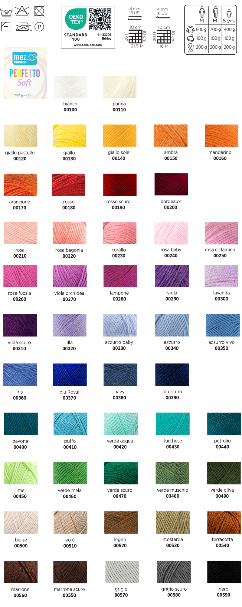 Perfetto Soft è un filato 100% acrilico, anti pilling e certificato OEKO-TEX STANDARD 100. È molto morbido al tatto e ideale per realizzare modelli da indossare, accessori e progetti home decor sia ai ferri che all’uncinetto. Disponibile in una gamma di 50 colori a tinta unita.